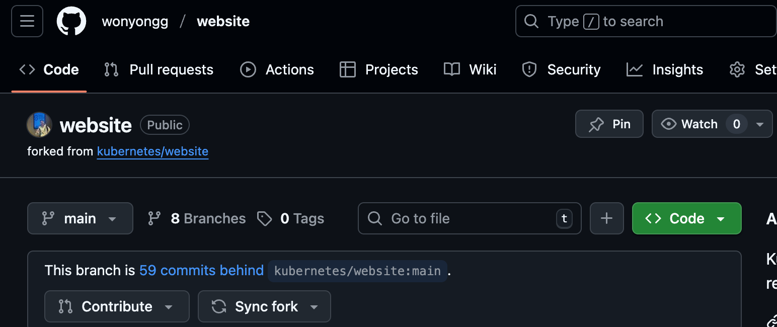 - kubernetes/website 저장소를 포크 하여, 본인 저장소로 가져온다.